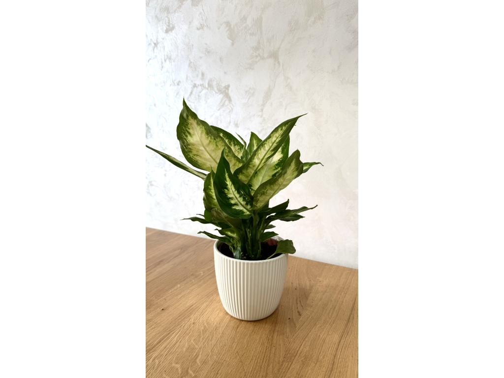 🌿 Dieffenbachia 'Camilla', známá také jako „němá třtina“ (due to its sap causing temporary speech loss if ingested), je oblíbená pokojová rostlina ceněná pro své velké, nápadně panašované listy, které okamžitě rozzáří každý interiér. Pochází z tropických oblastí Ameriky a kultivar 'Camilla' se vyznačuje svěže zelenými okraji listů, které přecházejí do krémově bílého až světle žlutého středu, vytvářejíc tak elegantní a svěží vzhled. Roste vzpřímeně a může dosáhnout úctyhodné velikosti, což z ní dělá výrazný solitérní prvek. Je poměrně nenáročná na pěstování, pokud jsou dodrženy základní podmínky, a je skvělou volbou pro ty, kdo hledají dekorativní rostlinu s tropickým nádechem.