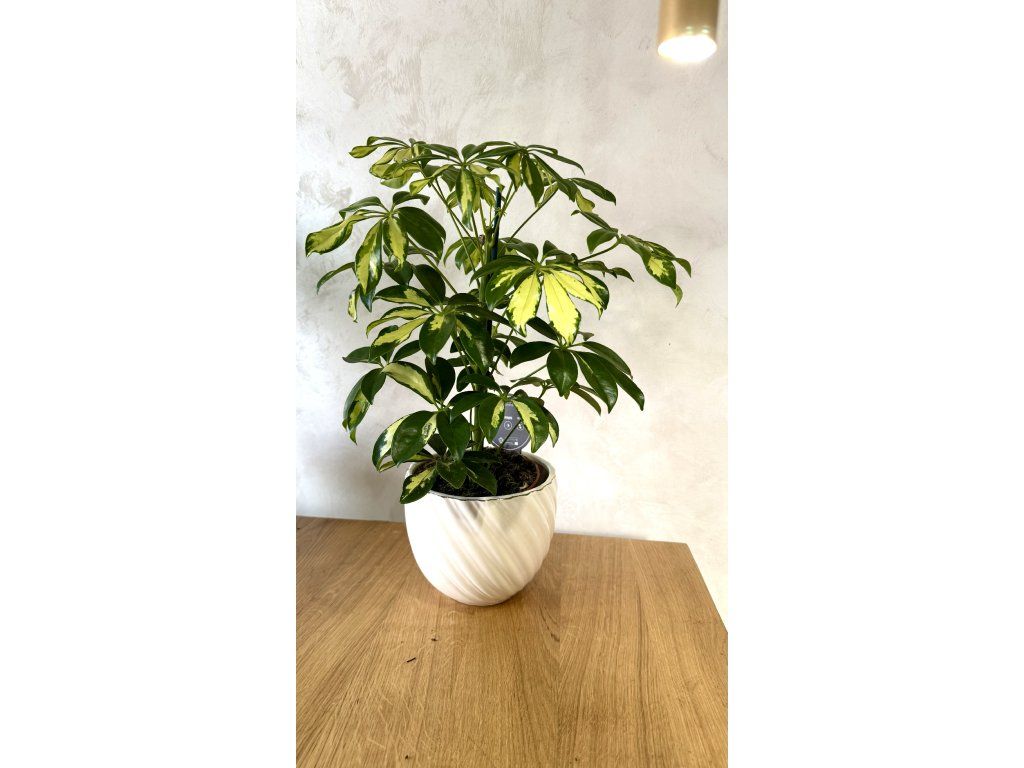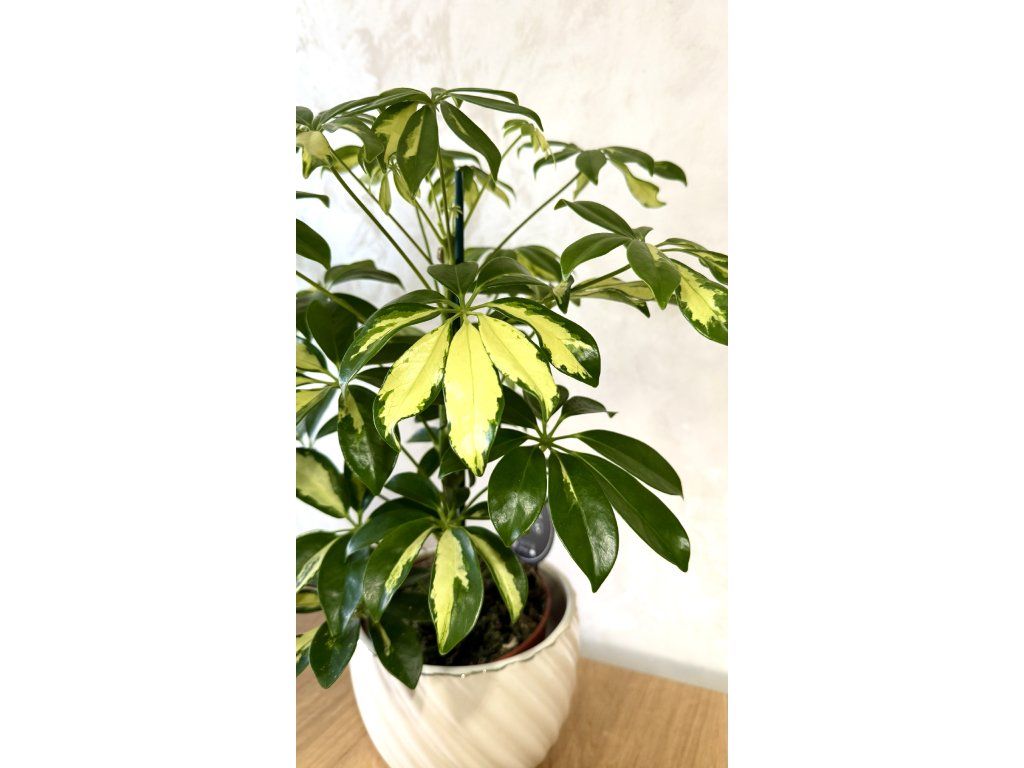 ☂️ Tato kombinace barev dodává rostlině svěží a živý vzhled. Schefflera 'Gerda' roste jako kompaktní keř nebo malý stromek a je ideální volbou pro ty, kdo hledají dekorativní rostlinu, která zároveň přispívá k lepší kvalitě vzduchu v interiéru.