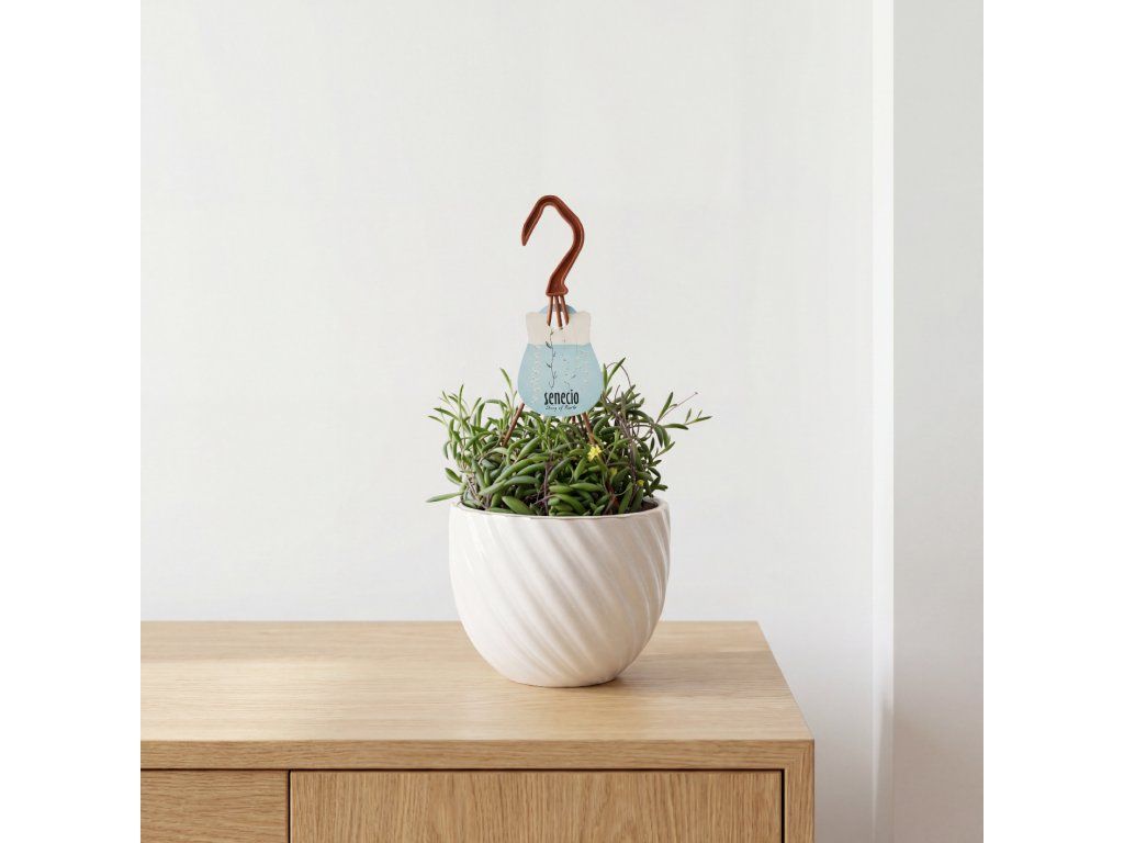 ⚠️ Pozor: Curio rowleyanus je považována za mírně toxickou pro lidi i domácí zvířata, pokud dojde k požití. Obsahuje alkaloidy, které mohou způsobit trávicí potíže (zvracení, průjem) a podráždění. Doporučuje se umístit ji mimo dosah dětí a zvířecích mazlíčků, kteří mají tendenci okusovat rostliny.