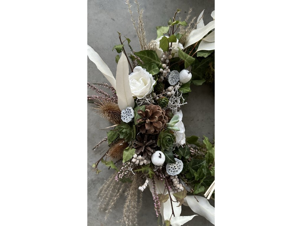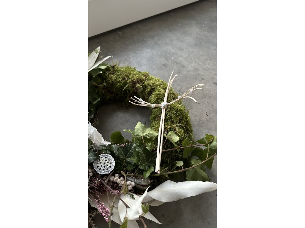 Vázaný mechový věnec s dekorací